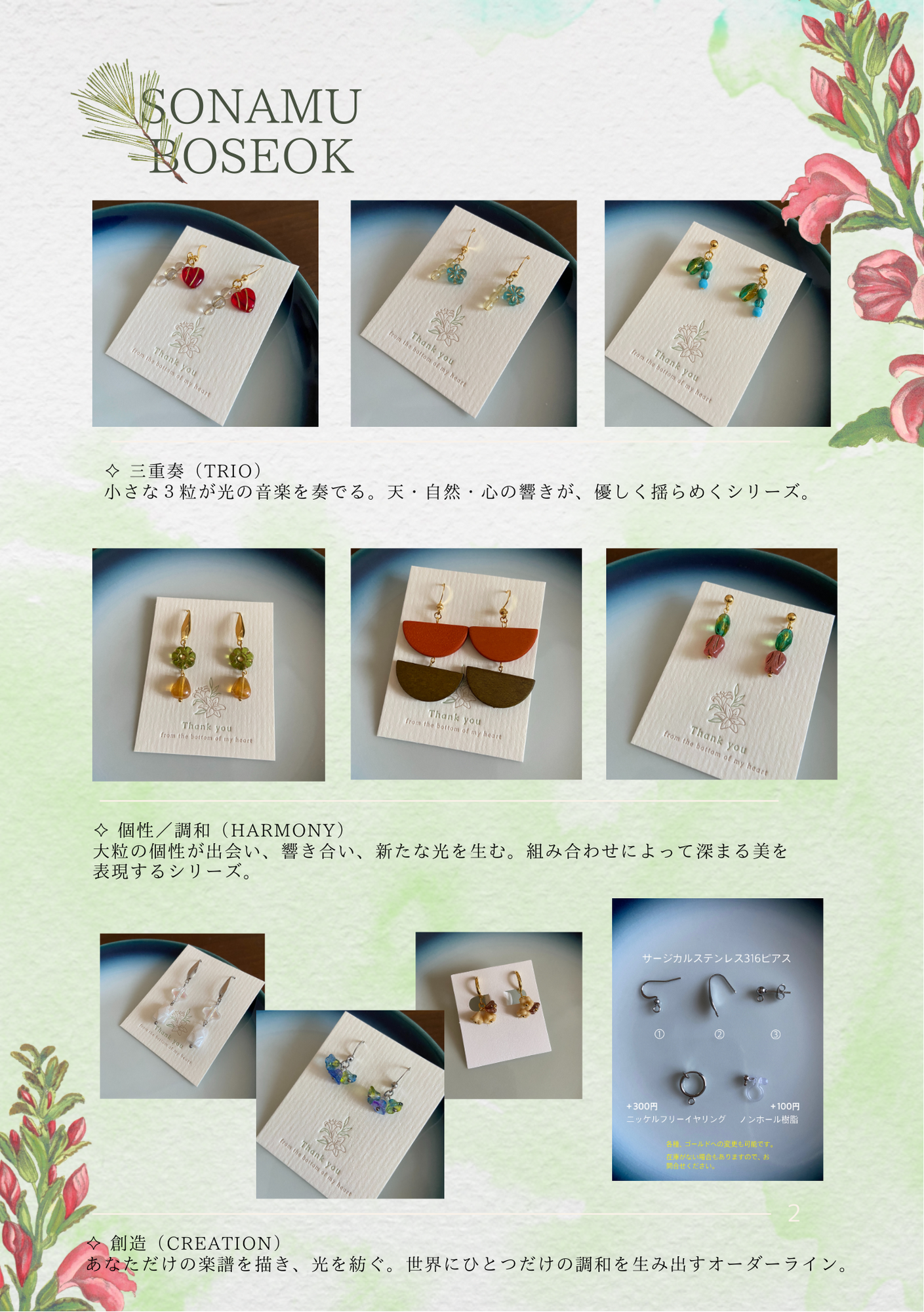 医療用にも使われる高品質なステンレス素材を使用しています。金属アレルギーが起きにくく、錆びにくい素材で、長く美しい輝きを保ちます。「316」と彫刻されているピアスフックを使用している作品があります。